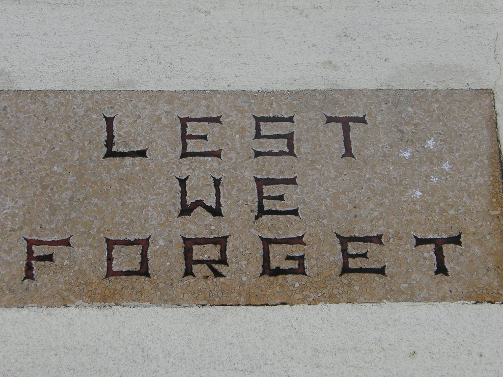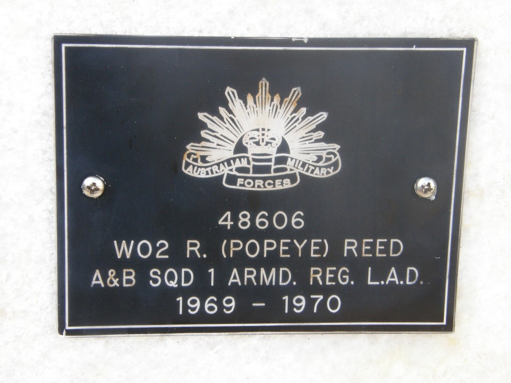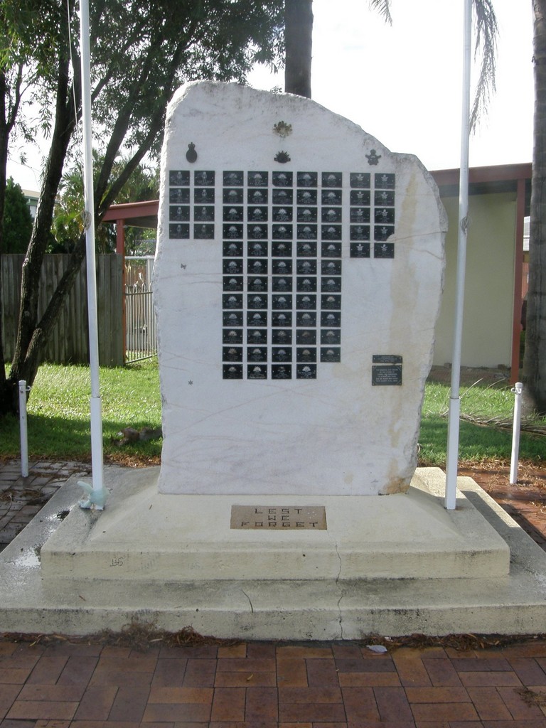 Eight plaques in two rows down left side, fifty-nine plaques in five rows down centre and ten plaques in two rows down right side of stone. Dedication plaque at bottom right and LEST WE FORGET plaque on top step at bottom.