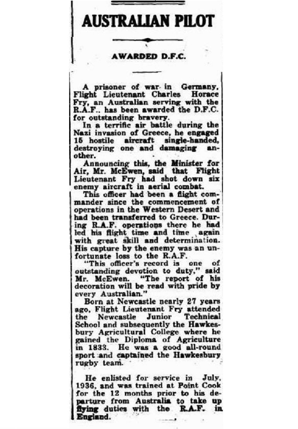 As the war continued, Charles was promoted to Flight Commander and served in the Battles of Greece and Crete (1941), fighting both Italian and German foes. In May 1941, during the invasion of Greece, he engaged 15 hostile aircraft, singlehandedly destroying one and damaging another. During this action, his Hurricane Fighter aircraft was shot down. Charles managed to parachute to safety. Despite being wounded and unable to fly, he remained with his squadron, protecting its assets and personnel and assisting with their evacuation. For his bravery during this costly campaign Charles was awarded the Distinguished Flying Cross (DFC). When announcing this commendation, Air Minister, Mr. McEwen, noted that “Flight Lieutenant Fry had shot down six enemy aircraft in serial combat.” This was a slight exaggeration of the events, but was well received by the media and the Australian public.