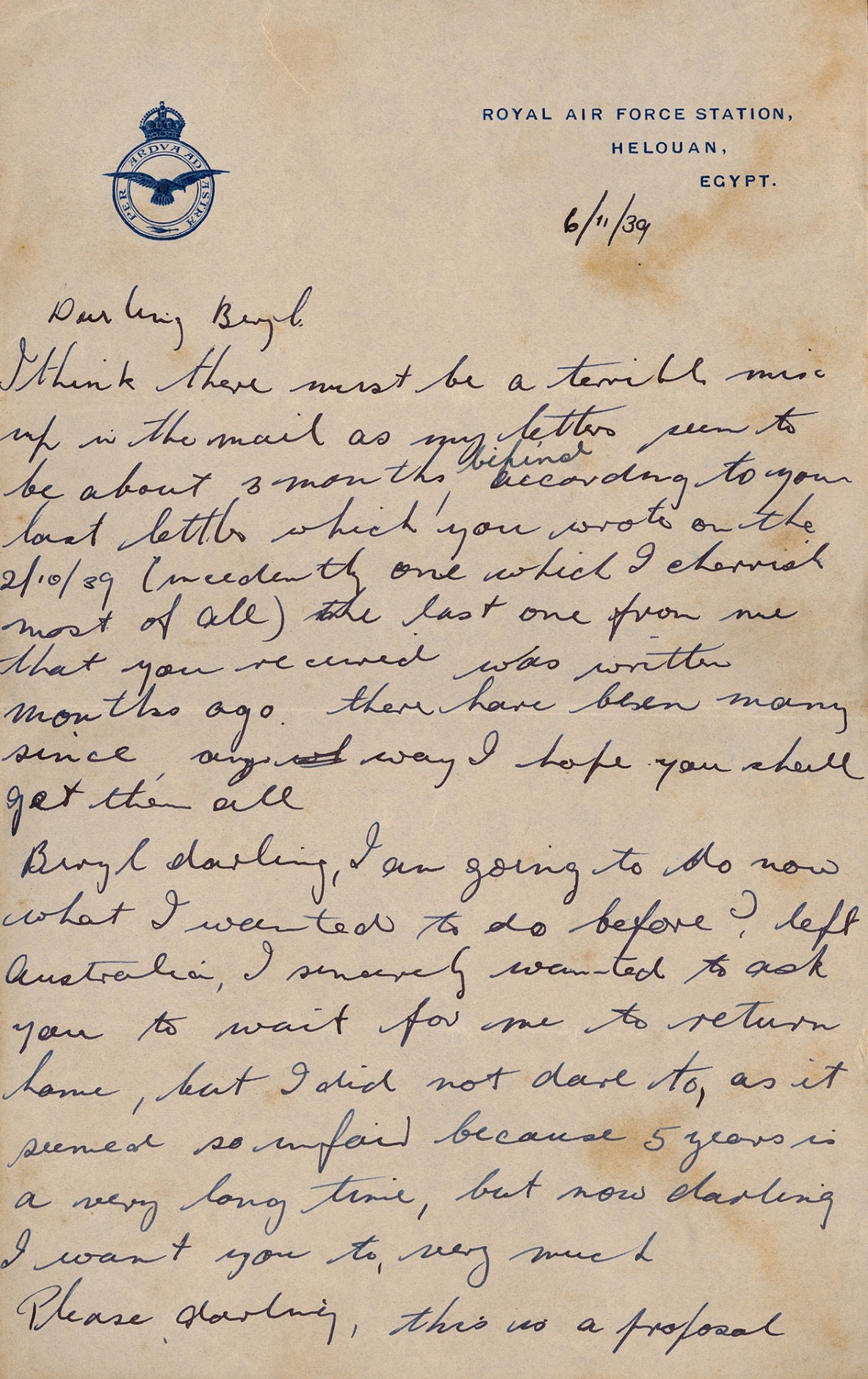 Beryl darling, I am going to do now what I wanted to do before I left Australia, I sincerely wanted to ask you to wait for me to return home, but I did not dare to, as it seemed so unfair because 5 years is a very long time, but now darling I want you to, very much. Please darling, this is a proposal. I want to marry you, it will not be long before I shall be able to send enough money for your passage. Darling you know that I love you and that I want you more than anything that I have ever thought of wanting...” (Letter, 1939, 31299/34, pg. 1-2).