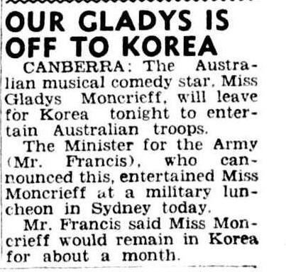 - Our Gladys is Off to Korea, Brisbane Telegraph, Friday 24 August 1951, pg. 3.