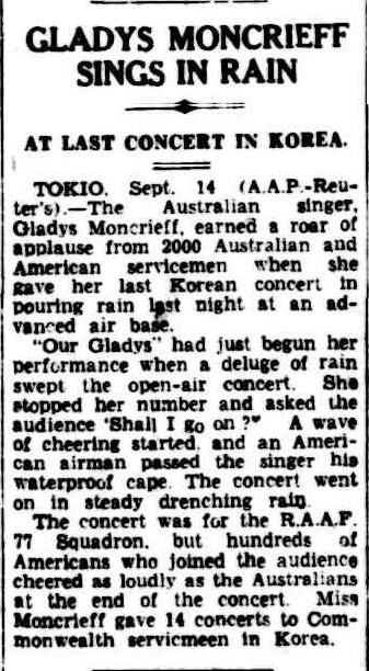 - Gladys Moncrieff sings in Rain, Cairns Post, Saturday 15 September 1951, pg. 1.