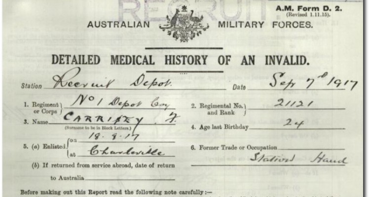 Thomas Carrisey enlisted in Charleville 9 June 1917 and was assigned to No.1 Depot Company. Thomas was not accepted for service based on his heritage - his mother was an Aboriginal woman - Margaret Williams and his father a South Sea Islander - William Carrisey.
